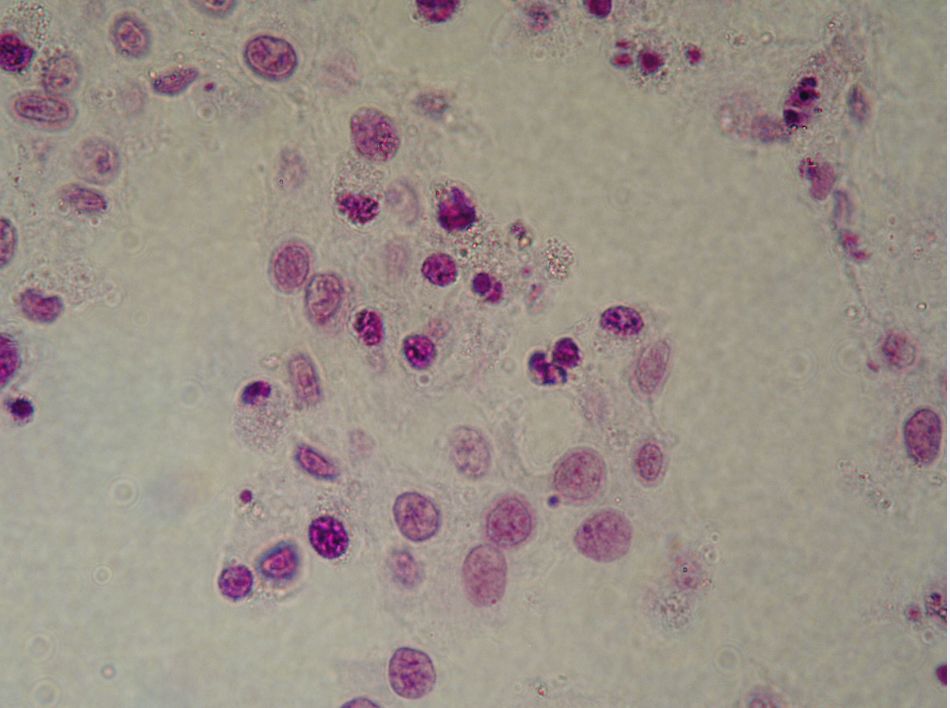 | Клітини букального епітелію. (Архів цитопрепаратів крові та кісткового мозку, відділ онкогематології ІЕПОР НАНУ). |