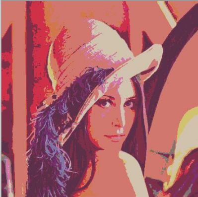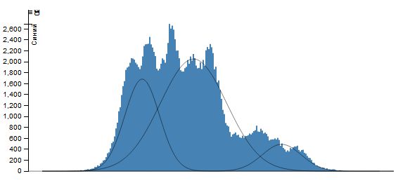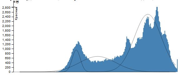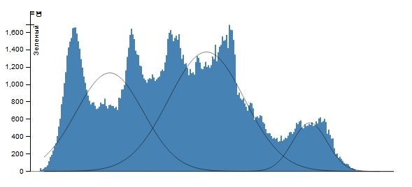 Вважаючи, що кожна гістограма являє собою суміш функцій Гаусса \[ \sum_{i=1}^n\frac{\omega_i}{\sigma_i\sqrt{2\pi}}\exp\left(-\frac{(x-\mu_i)^2}{2\sigma_i^2}\right) \] застосуємо ЕМ-алгоритм із заданою кількістю елементів суміші n (це ж кількість сегментів, на яке ми розбиваємо кожну колірну площину зображення). І як результат, нехай множина значень інтенсивності \(X_j=(x_j,x_{j+v_j }\) ) така, що \[ \forall x\in X_j: \frac{\omega_j}{\sigma_j\sqrt{2\pi}}\exp\left(-\frac{(x-\mu_j)^2}{2\sigma_j^2}\right)\ge \frac{\omega_i}{\sigma_i\sqrt{2\pi}}\exp\left(-\frac{(x-\mu_i)^2}{2\sigma_i^2}\right) (i\ne j). \] Тоді всім точкам, інтенсивність яких лежить в проміжку \(X_j\). Поставимо у відповідність значення \(\mu_j\) (при практичній реалізації - її цілу частину). Результатом роботи алгоритму буде сегментація зображення на n сегментів по кожній колірної компоненті.