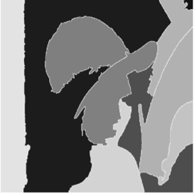 Розподіл вузлів \(S\left(\left\{a_{i+\frac{1}{2}}\right\}_{i=1}^{n-1},\Delta_n,x\right)\) у разі наближення гістограми зображення може служити множиною порогів для сегментації даного зображення.Ясно, что кожен сегмент буде складатися з декількох не зв'язаних з собою областей. Наступним кроком буде злиття областей, тобто, якщо кількість точок, з яких складається область, менше заданого числа К, то дану область будемо об'єднувати з тією сусідньою областю, рівень сегментації якої найбільш схожий з рівнем поточної області.