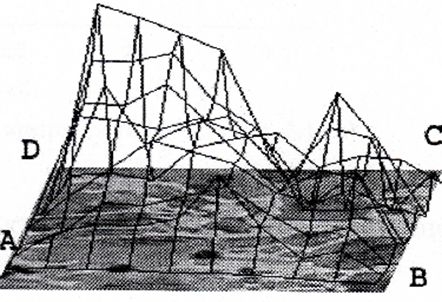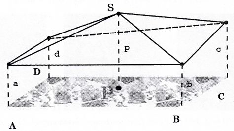 Розглядається центральний пиксель Р и його оточення - квадрат ABCD, лінії між величинами a, b, с, d, р - утворять 4 трикутники з вершиною S та площею: \[ S_p=\sum_{i=1}^4Str_i,Str_i=F(x_i,y_i,r), \] де \(S_p\) - площа фігури, \(Str_i\)- площа і-го трикутника \(i = 1..4, x_i, y_i\) - координати пікселів (вершини і-го трикутника), r - сторона квадрата ABCD.Подібна процедура повторюється для всіх пікселів зображення. Для фіксованого r площі всіх фігур формують одну загальну площу A.