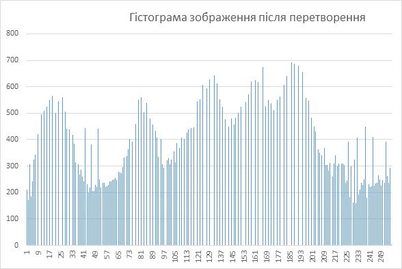 Функція перетворення має вигляд: \(y=k\cdot x\cdot(x_\max-x)\), де \(x_\max\) - максимальне значення вихідного сигналу, а \(k\)- константа, що дозволяє управляти динамічним діапазоном перетвореного зображення. Функція, що описує дане перетворення, є квадратичною параболою. При \(y_\max =x_\max \) динамічні діапазони зображень збігаються, що може бути досягнуто при \(k=4/x_\max.\)![]() |