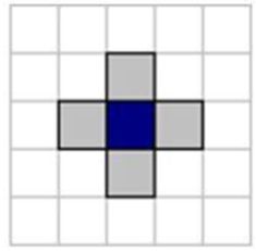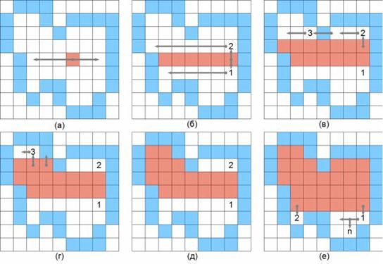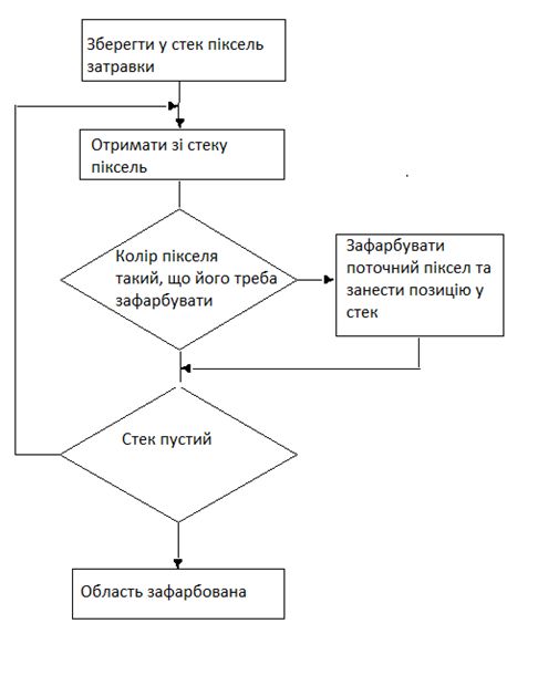 Для визначення точок, які належать області, в тому числі, а також знайти кількість точок області, треба використати той чи інший алгоритм заповнення однозв'язаної області. Розглянемо один з них.Простий алгоритм заповнення Затравка(х, у) видає затравочний піксел. Push - процедура, яка вкладає піксел в стек. Pop - процедура, яка виймає піксел зі стека. Піксел(х, у) = Затравка(х, у) Push Піксел(х, у) ; ініціалізація стеку While (стек не пустий) Pop Пиксел(х, у) ; виймаємо піксел зі стека If Пиксел(х, у) <> Нов_значенняthen Пиксел(х, у) = Нов_значення End if Перевірка, чи треба вкладати сусідні пікселі у стек If (Піксел(х + 1, у) <> Нов_значення and Піксел(х + 1, у) <> Гран-значення)then Push Піксел (х + 1, у) If (Піксел(х, у + 1) <> Нов_значення and Піксел(х, у + 1) <> Гран_значення)then Push Пиксел (х, у + 1) If (Піксел(х - 1, у) <> Нов_значення and Піксел(х - 1, у) <> Гран_значення)then Push Піксел (х - 1, у) If (Піксел(х, у - 1) <> Нов_значення and Піксел(х, у - 1) <> Гран_значення)then PushПіксел (х, у - 1) End If EndWhile
