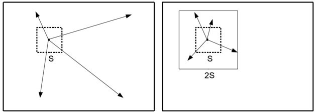 Це робиться для того, щоб уникнути центрування суперпікселя по краю, і щоб зменшити ймовірність співпадання суперпікселів з зашумленим пікселем. Оскільки очікувана просторова протяжність суперпікселя є областю приблизно розміру S × S, пошук подібних пікселів здійснюється в області 2S × 2S навколо центру суперпікселів.Як тільки кожен піксель асоціюється з найближчим центром кластера, крок оновлення регулює центри кластера як середнього вектору \([l a b x y]^Т\) всіх пікселів, що належать кластеру.