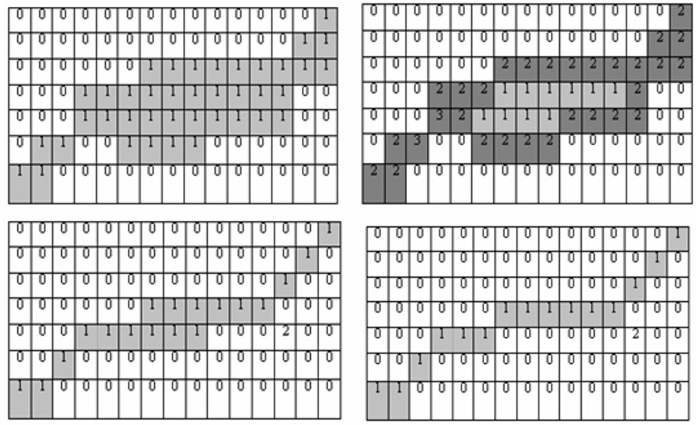 Будемо називати точки \((x_1,y_1)\) та \((x_2,y_2)\) сусідніми, якщо вони задовольняють умові зв'язності, а саме, для 4-х зв'язної області умова зв'язності має вигляд: