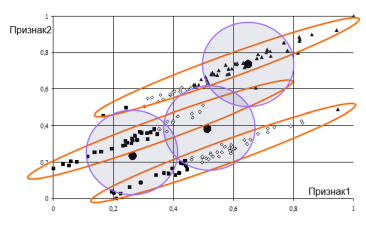 расстояние Махалонобиса \[d_M(x_i,x_j)=\|x_i-x_j\|_M=\sqrt{(x_i-x_j)^T\Sigma^{-1}(x_i-x_j)}\] используется в случае, если нужно учесть корреляцию на конкретном классе.