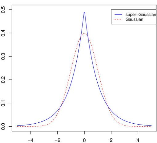 гауссовского распределения. Эксцесс любого другого распределения является либо положительным, если оно super-Gaussian (пикообразней чем гауссовское)