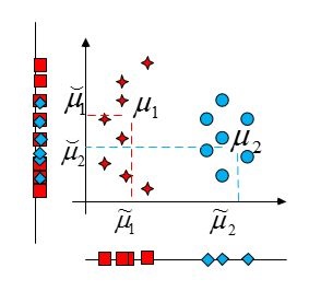 Оценим степень разделения проекций различных классов. Пусть \(\mu_1\) и \(\mu_2\) средние значения первого и второго классов, а \(\tilde{\mu}_1\)