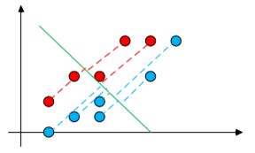 Эта плоскость разделяет классы. Для того, чтобы метод корректно разделял классы, нужно, чтобы все точки (документы) одного класса