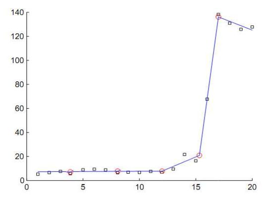 найдем \(X_i=\hat{s}_2(\{z_i\}_{i=0}^N,t_i)\) и решая систему уравнений (\ref{e:1}) и (\ref{e:2}), находим значения \(M_i\) и \(m_i\) \(i=1,...,n-1\), которые позволяют получить регрессионный сплайн (\ref{regression}).
