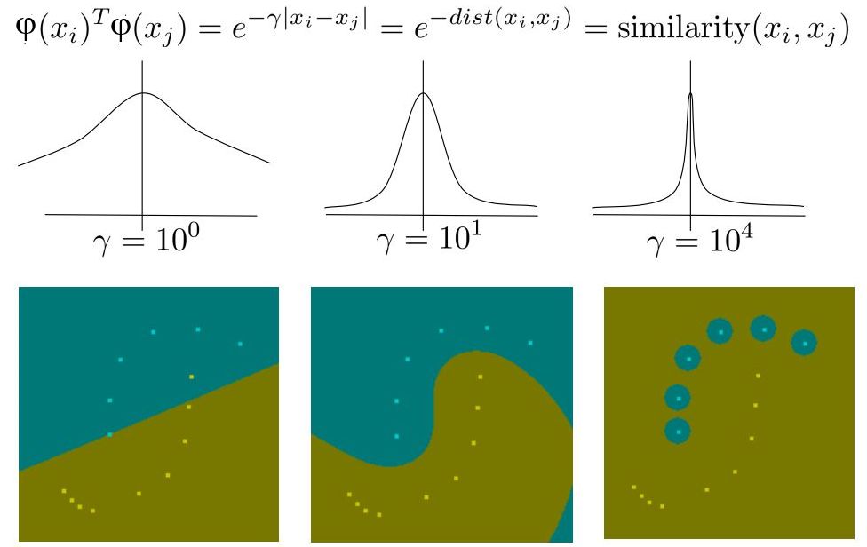 Использование экспонентциального ядра - в первом случае "почти" линейная дискриминантная функция, в последнем, "почти" метод ближайшего соседа.