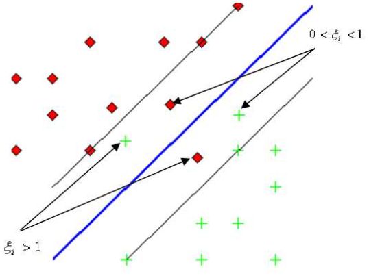 полосе, но со стороны своего класса, то соответствующий вес будет \(0\lt \xi _i \lt 1\), Для идеального случая будем считать \(\xi _i \lt 0.\)