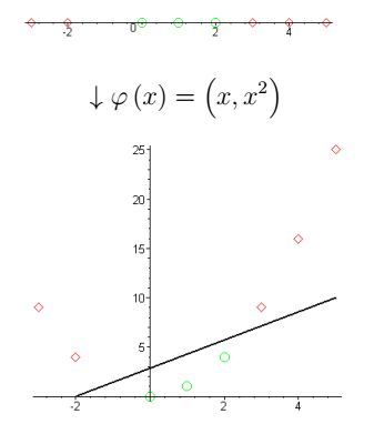 Другой идеей метода опорных векторов (в случае невозможности линейного разделения классов), является переход в пространство большей размерности, в