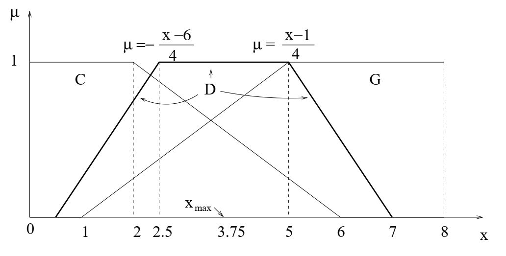 Чтобы найти максимизирующее решение, рассматриваем значение на вспомогательном интервале D, на котором µD (x) имеет максимальную степень принадлежности