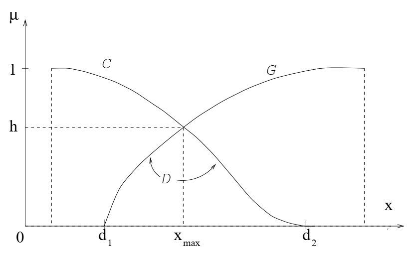 По определению (Bellman и Zadeh (1970)) решение представляет собой нечеткое множество D с функцией принадлежности µD (x), выраженной как пересечение G и С.