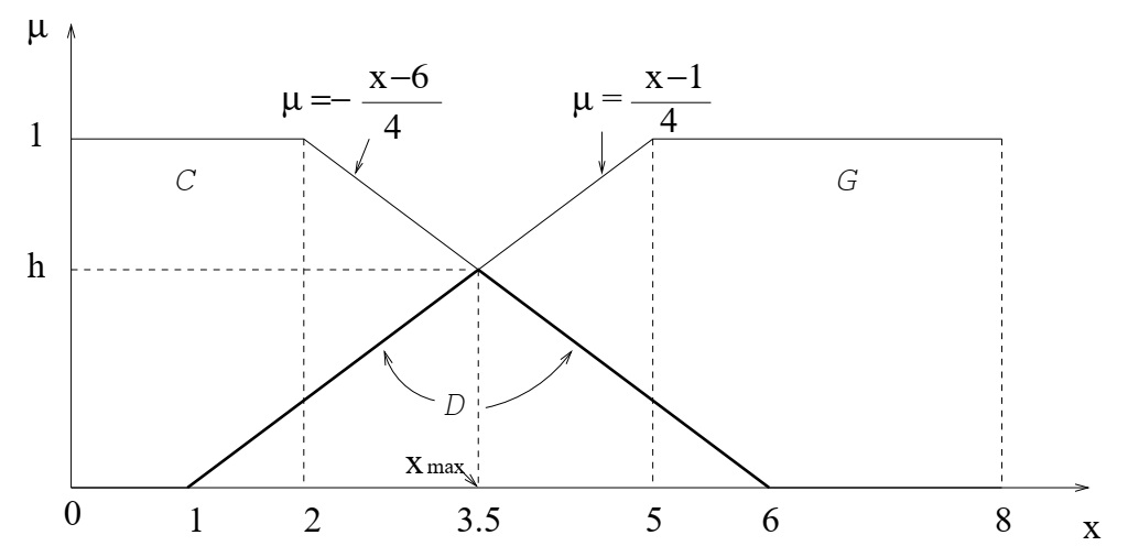 \(µ = -\frac{x-6}{4}\) равна (3.5, 0.625), то есть \(x_\max = 3.5; h =\max µ_D (x) = 0.625\).