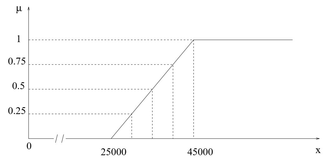 \mu_G(40 000) = 0.75, \mu_G(35 000) = 0.5, \mu_G(30 000) = 0.25.