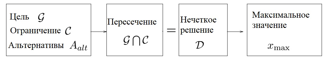 Согласно первому подходу (Беллман-Заде (1970)), принятие решений определяется как пересечение целей и ограничений, описываемых нечеткими множествами.