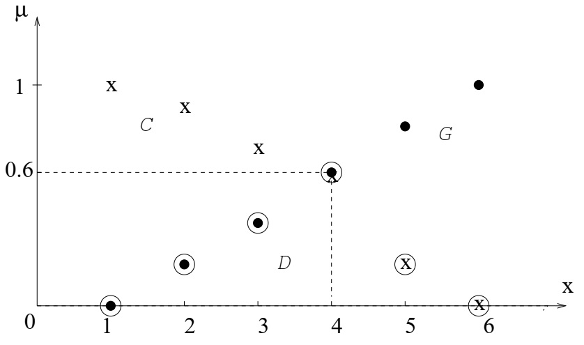 Здесь \([d_1; d_2] = \{1, 2, 3, 4, 5, 6\}, h = 0.6\) и максимальное решение - это \(x_\max = 4\) с наивысшей степенью принадлежности к D, равной 0,6.
