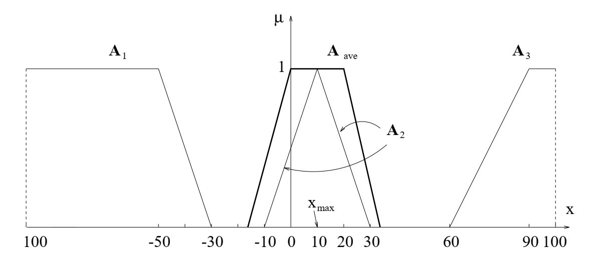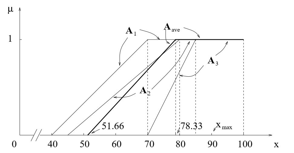 Дефаззификация Aave дает максимальное значение \(\frac{78.33 + 100}{2} = 89.16 ≈ 90\).