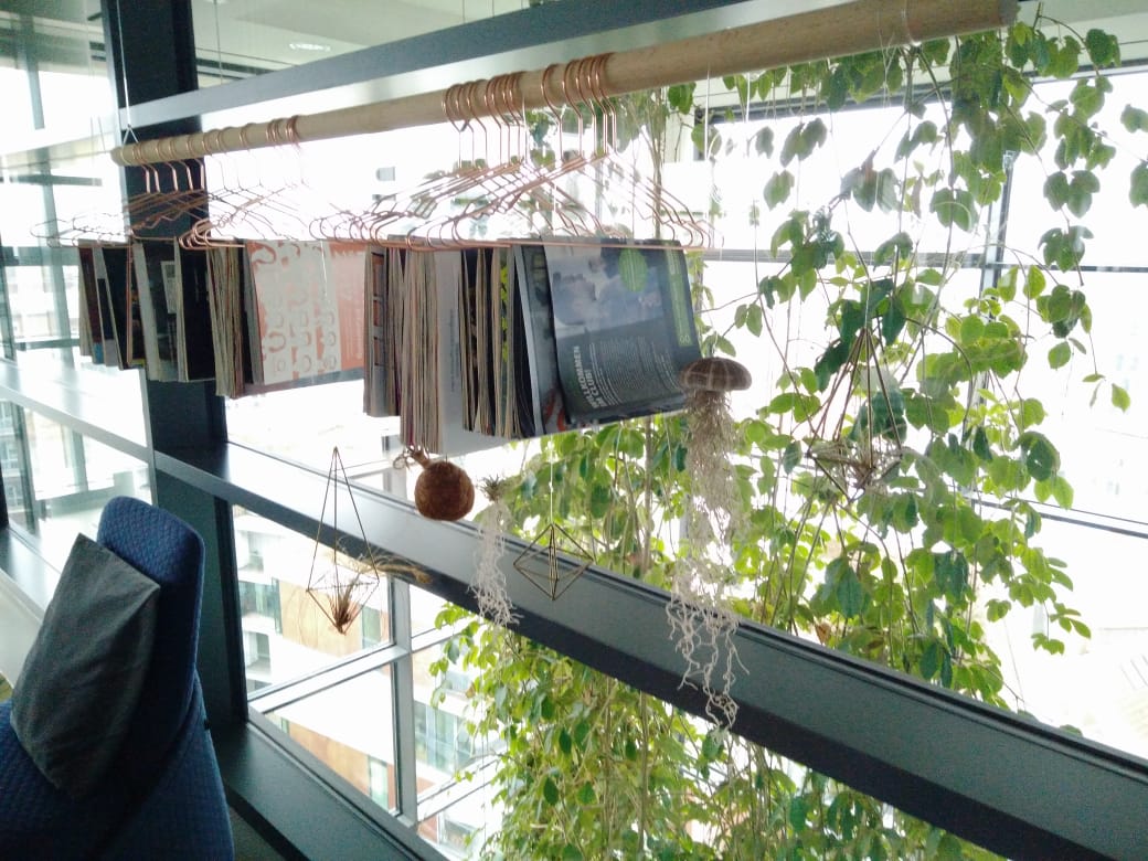 Уздовж всіх поверхів зона релаксу - скляна стіна, уздовж якої ростуть ліани. Тут же можна почитати журнали. Ось так виглядає "полка" з журналами.