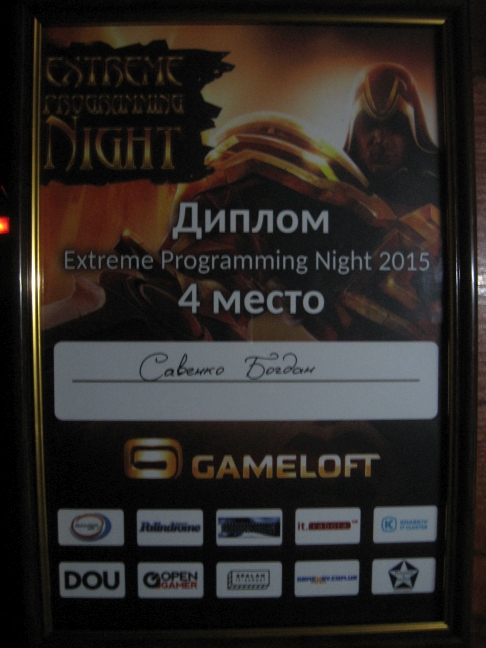 Студент третього курсу (гр.ПЗ-13-1д) Савенко Богдан приймав участь в конкурсі "EXTREME PROGRAMMING NIGHT", який проходив у місті Харків. Пройшовши на четвертий етап конкурсу, він посів почесне четверте місце. Наші вітання Богдану!